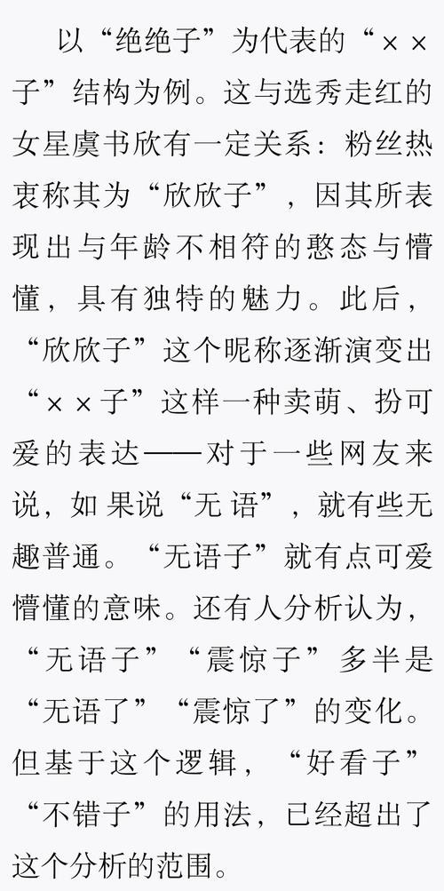 〖Two〗、“无语子”、“绝绝子”是近年来网上流行的梗,分别表示“真是无语”和“真是绝了”。它们的创新之处在于将“子”从名词转变为了形容词,甚至能作定语,如“绝绝子奶茶”。在历史上,“×子”也曾是动词,意为“玩儿”。而“×儿”多为名词。这两个词的创新使用,体现了语言的灵活性和创造性。