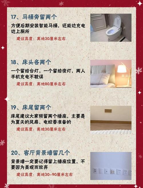 〖One〗、插座预留位置已考虑周全。在家庭装修中,插座的预留位置是至关重要的,它直接关系到日后家居生活的便利性和安全性。以下是对各个区域插座预留位置的详细考虑: 门厅 预留数量:1个位置与用途:主要用来控制门厅处的照明,同时也方便一些智能产品的使用,如小型家用刷鞋机、挂烫机等。插座应设置在方便操作且不易被遮挡的位置。