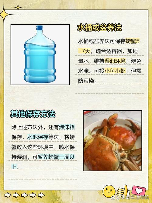 室温存放法 适宜温度:如果室温在15~25℃之间,可以将螃蟹放在宽敞的盒子或盆子中。定时喷水:为了保证螃蟹的生存环境湿度,需要定时给它们喷洒一些水。存活时间:此方法可以保存螃蟹存活3~5天。浴缸活养法 环境设置:将螃蟹放在浴缸中,浴缸四面光滑可以防止螃蟹逃跑。