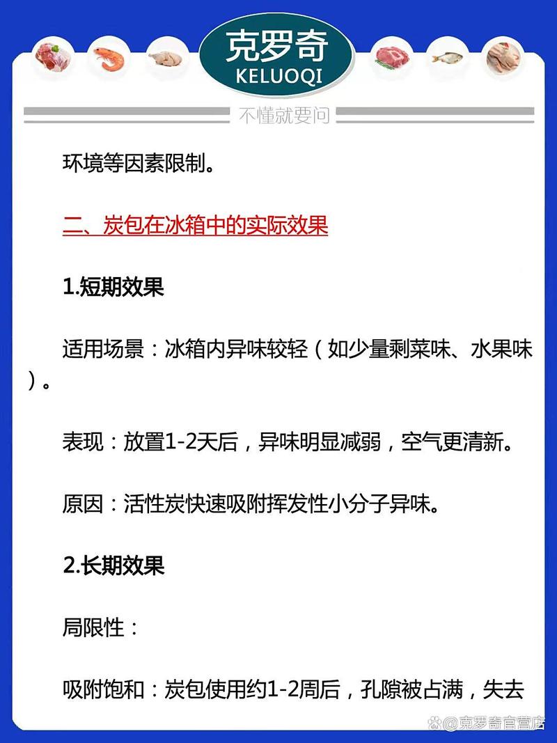 〖Three〗、有用,但需要搭配正确用法。 冰箱异味主要来自食物残留挥发或腐败菌滋生,活性炭依靠自身多孔结构可以吸附部分异味分子,但实际使用时有几个关键点需要注意。 活性炭包的正确用法: 定期更换:活性炭吸附饱和后会失效,建议每1『2』个月更换一次,或通过暴晒两小时恢复部分吸附能力。