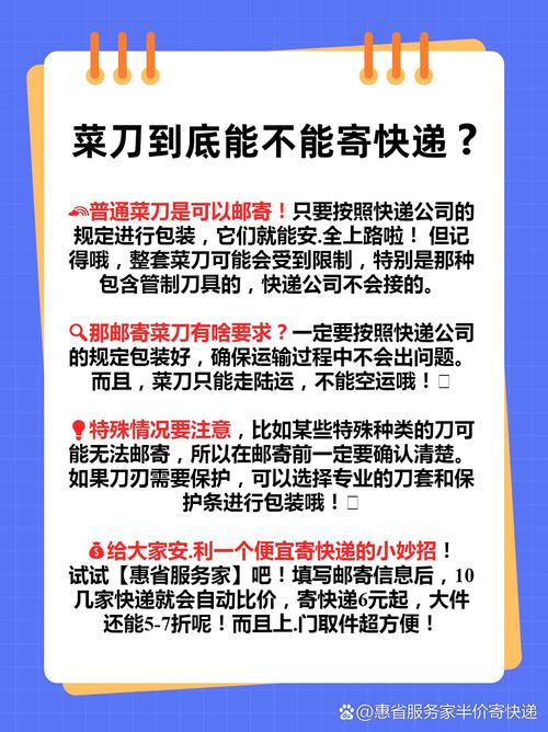 〖Four〗、关于顺丰能否寄送菜刀的规定,答案是明确的:顺丰的空运服务不接受菜刀的邮寄,但陆运服务则可能有所不同。圆通、申通、中通、德邦等大型快递公司均明确表示,由于行业规定,他们不支持菜刀的邮寄。