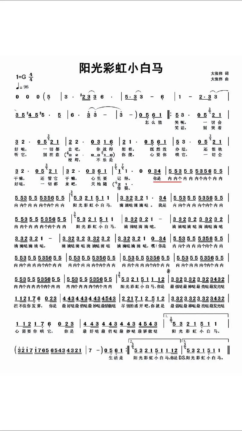 《阳光彩虹小白马》作词:大张伟 作曲:大张伟 歌手:大张伟 歌词:怎么能哭呢一切会好哒,一切都去吧你就得想着。既然没办法还恨他干嘛,还管它干嘛心里要记得。你是内内个内内,内个内个内内。内内个内内,内个内个内内。阳光彩虹小白马,滴滴哒滴滴哒。我是内内个内内,内个内个内内。