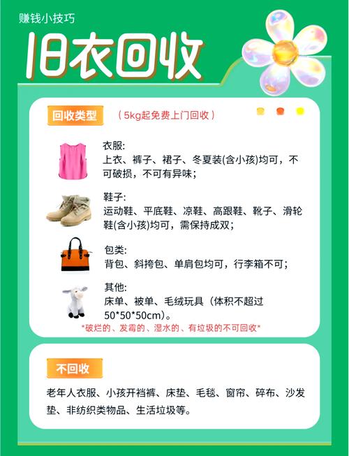 乡镇收旧衣服赚钱的方式主要有以下几种:旧衣深加工:变废为新:可以通过简单的加工工序,将旧衣服改造成新衣服或者其他实用的纺织品,如抹布、抱枕套等。这种方式关键在于创新和设计,使旧物焕发新生。