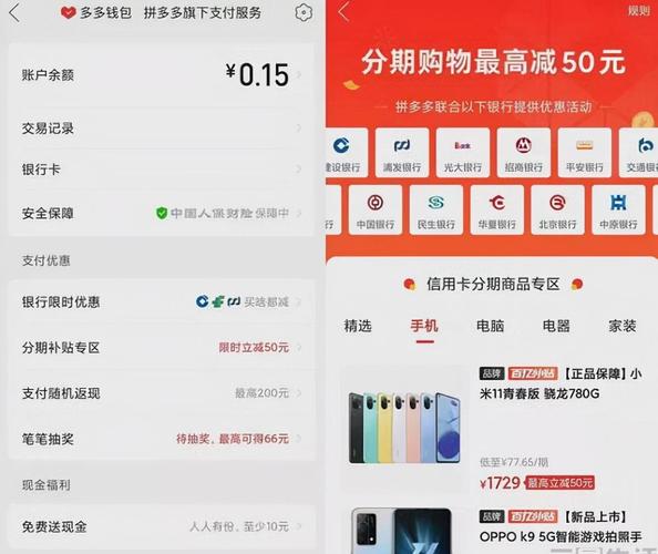 〖Five〗、花呗分期、银行卡分期。花呗分期:有开通了支付宝花呗服务,在拼多多上使用花呗分期付款非常方便。选取花呗分期付款,根据指引选取合适的期数即可。银行卡分期:拼多多还支持银行卡分期付款,支持银行卡分期付款,就可以使用银行卡分期付款。