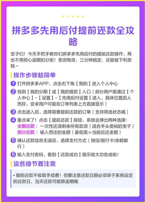 〖One〗、在拼多多平台上,分期还款功能可以在订单或购物车支付环节中找到。 拼多多支持多种支付方式,如微信支付和银行卡支付,这些支付方式在交易完成后不需要额外还款。 若选取花呗分期付款,应在每个月的还款日之前,通过花呗界面操作还款。