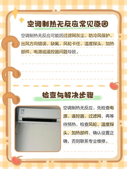 〖One〗、空调按制热没反应的常见原因及解决方法操作层面问题 模式设置错误:部分空调需先将模式调至「制热」(图标通常为太阳),而非直接按制热键,若误选「制冷」「送风」等模式,会无制热反应。 温度设置过低:制热时需将温度调至高于当前室温(如设为25℃),若温度低于室温,空调会默认无需制热,不会启动。
