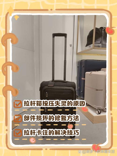 〖Two〗、行李箱拉杆按不下去的解决办法如下:检查拉杆箱质量 首先,确认拉杆箱是否因为质量问题导致拉杆按钮无法按下。如果拉杆箱是新买的,且在使用过程中未受到严重撞击或超载,那么可能是产品本身的质量问题。此时,建议联系商家进行退换货或维修。检查拉杆松动情况 长时间使用或超载可能导致拉杆部件松动。