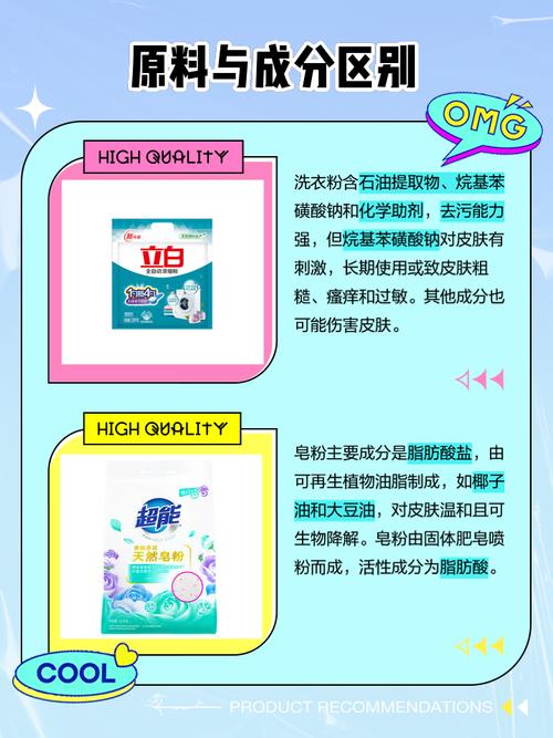 〖Four〗、成分 肥皂粉:主要由可再生油脂构成,这种天然成分使其性质温和。 洗衣粉:以石油提炼物为基本成分,并包含化学摩擦剂,成分相对更为复杂。适用性 肥皂粉:因其温和的特性,特别适合清洗敏感肌肤的衣物,如贴身衣物和婴儿衣服。