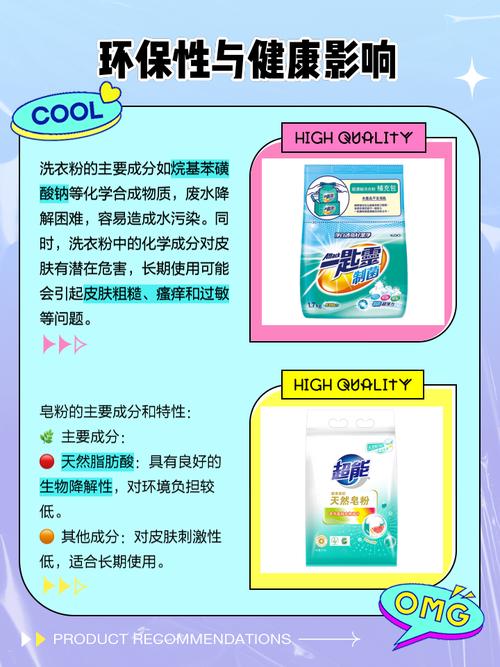 〖Five〗、肥皂粉:主要由约90%的可再生植物油脂构成,天然成分较高。洗衣粉:由硼酸盐和硅酸盐等合成材料构成,含有阴离子表面活性剂、非离子表面活性剂、水软化剂等化学成分。天然特性与对皮肤刺激性:肥皂粉:对皮肤刺激性低,适合清洗贴身衣物,且洗涤后衣物无需额外使用柔顺剂也能保持蓬松柔软。