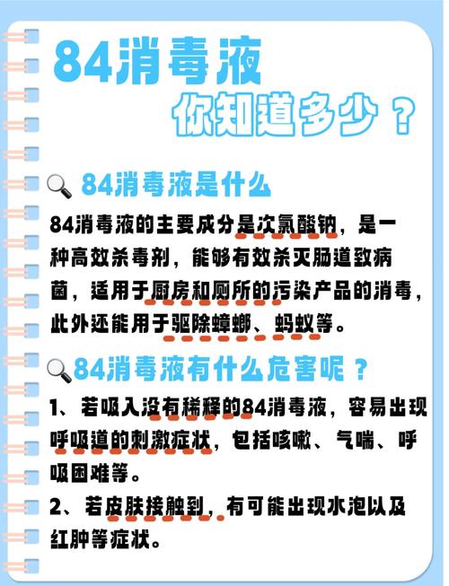 使用风险较高84消毒液具有强烈的刺激性和腐蚀性。用它来杀虫,其挥发的氯气会刺激人体呼吸道,可能引发咳嗽、呼吸困难,对宠物也有同样危害。同时,它还会腐蚀家具表面、损伤衣物纤维,并可能导致植物枯萎。