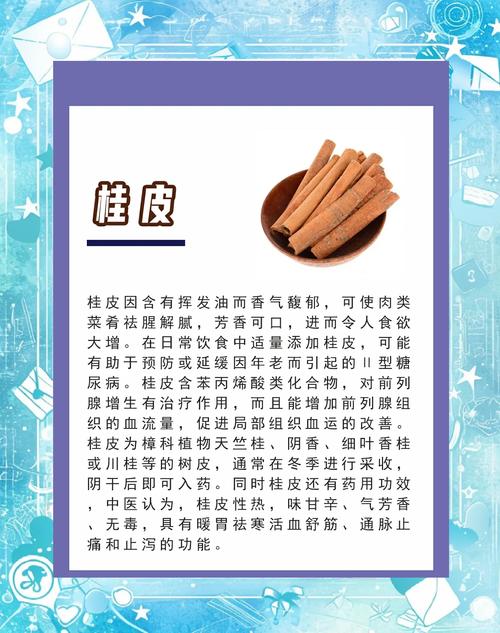 〖Four〗、桂皮具有多种功效,主要包括补元阳、暖脾胃、除积冷、通脉止痛和止泻等,其食用方法多样。桂皮的主要功效 温肾壮阳:桂皮能够温补肾阳,对于肾阳不足导致的畏寒、肢冷、腰膝冷痛等症状有很好的缓解作用。同时,它还能治疗肾不纳气引起的虚喘和气逆。