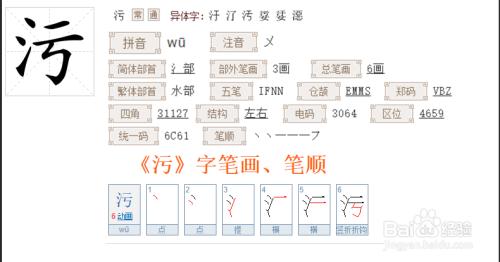 〖Five〗、污拼音:wū 。笔划:6 部首:氵 五笔输入法:ifnn 基本解释:前一篇:汍 后一篇:汐污 wū 浑浊的水:粪污。血污。 肮脏,不干净:污水。污泥。污浊。 肮脏的东西:污渍。污垢。 不廉洁:贪污。 弄脏:玷污。污损。污辱。污蔑(a.玷污;b.诬蔑)。污染。