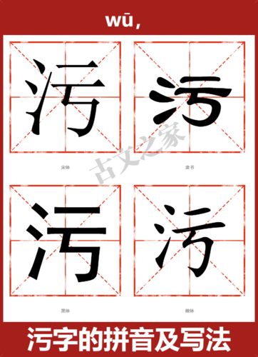 〖Four〗、污的拼音是wū。“污”,现代汉语规范一级字(常用字),普通话读音为wū,最早见于金文中,在六书中属于形声字。“污”的基本含义为停积不流的水,如污池;引申含义为肮脏,不干净,如污水、污泥。在日常使用中,“污”也常做名词,表示劳苦之事。