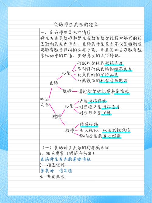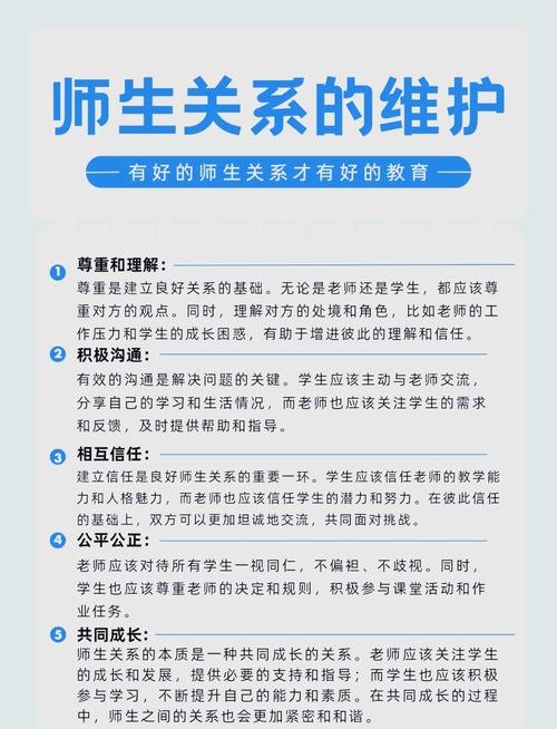 关于学生如何处理师生关系,可以从以下几个方面着手: 端正心态,相互尊重 学生应首先树立对老师的尊重意识,认识到老师在教学和人格上的尊严,这是建立良好师生关系的基础。同时,老师也应尊重学生的个性差异和学习需求,营造一个平等、包容的学习环境。