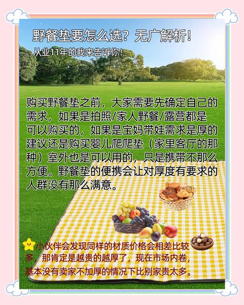 〖Two〗、选购野餐垫需重点关注防潮性能、便携性、颜值设计、尺寸、耐磨承重、多功能性及清洁保养七个方面,具体技巧如下:防潮性能防潮是野餐垫的核心功能。