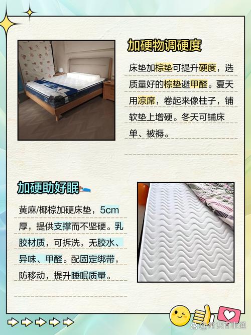 〖One〗、第一种是用硬质垫层叠加,例如购买3『5』cm厚的椰棕垫或黄麻垫铺在原有床垫上,这类天然纤维材料透气且硬度高,特别适合改善腰部支撑。习惯网购的年轻人可直接选购标注“加硬款”的床褥,线下则可到家居市场定制尺寸匹配的棕榈硬垫。若是临时应急,第二类方案是利用现成材料改造。