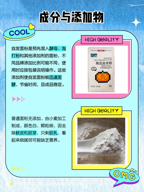 〖Two〗、我认为自发面和普通面在成分和制作上有区别。自发面含盐和泡打粉,能自行发酵,适合做馒头、包子等;普通面粉是纯净的小麦粉,用于非发酵食品。使用自发面时需遵循包装说明。