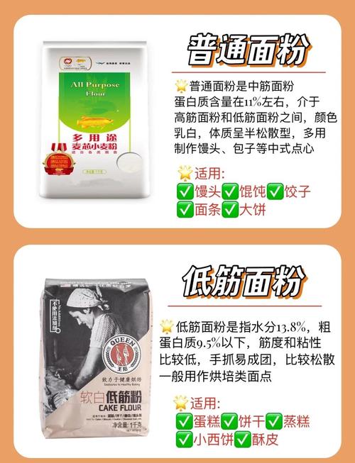 〖Three〗、普通面粉即指中筋面粉。以下是关于普通面粉(中筋面粉)的详细解定义与蛋白质含量 普通面粉,也即中筋面粉,其蛋白质含量大约在11%左右。这一蛋白质含量介于高筋面粉和低筋面粉之间,使得中筋面粉在筋度、黏度上较为均衡适中。市面常见性与用途 中筋面粉是市面上最常见的面粉类型。