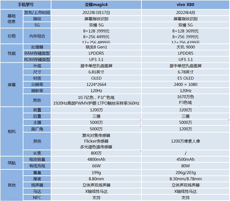 〖Three〗、综合来看,vivo X80在相机方面更具优势。续航:荣耀Magic 4内置4800mah电池,比vivo X80的4500mah多300容量,待机时间更长。但在充电速度方面,vivo X80的80W充电比荣耀Magic 4的66W更快。两者在续航和充电速度上各有千秋,可根据个人需求进行选取。