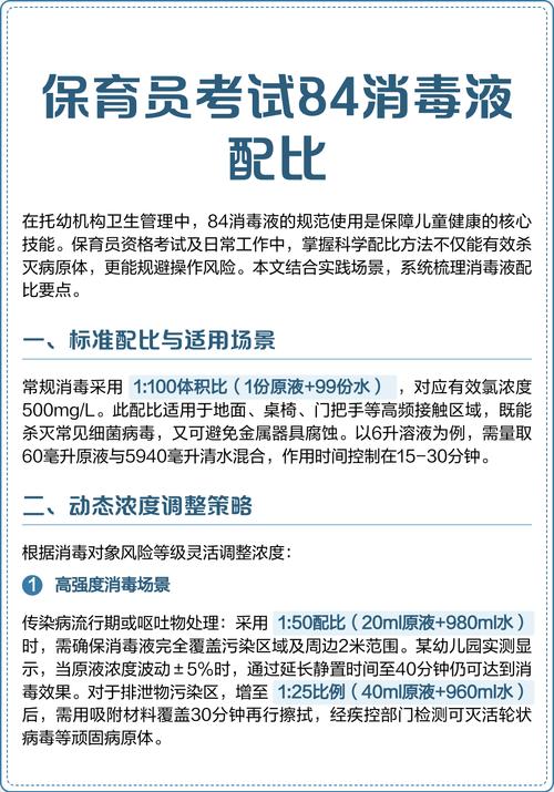 〖One〗、%的84消毒液日常清洁配比为10毫升原液加990余毫升水(1:100比例),疫情期间或高风险区域需加倍至1:50比例(300毫升原液兑30斤水),血液消毒需1:25比例(600毫升原液兑30斤水),洗水果餐具则为20毫升原液兑1『2』升水。