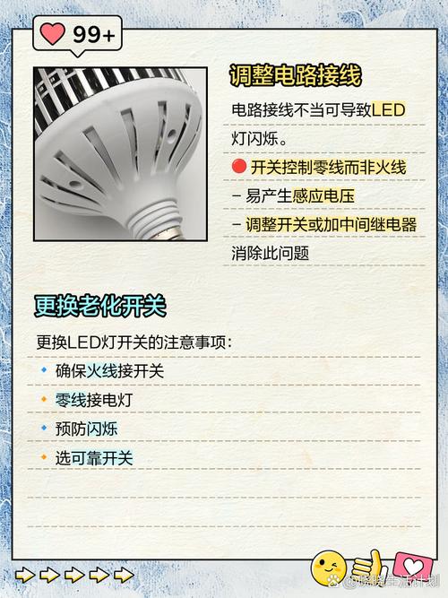 〖Three〗、可轻敲灯体底部观察是否停止闪烁,若有效建议更换驱动或整体灯头。 调光开关冲突非专业调光台灯接入旋钮式调光开关时,电压波动会导致频闪。普通按压开关的台灯接调光线路也易出现类似现象,建议更换为普通墙壁开关。 灯珠老化征兆LED灯珠寿命约2万小时,但部分灯珠提前损坏会造成整灯电流失衡。