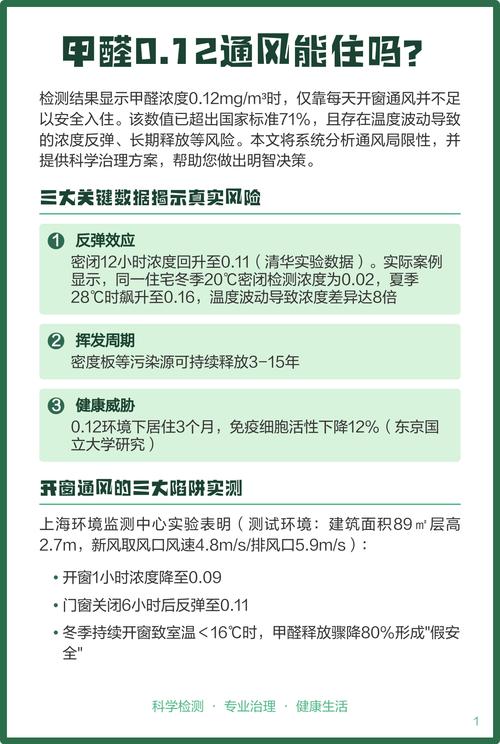 〖Three〗、甲醛0.12毫克/立方米,即使每天开窗也不建议入住。首先,根据室内空气甲醛含量的安全标准,安全上限为0.1毫克/立方米。而当前甲醛浓度为0.12毫克/立方米,已经超出了这一安全标准,属于超标范围。因此,从安全角度出发,不建议在此环境下入住。