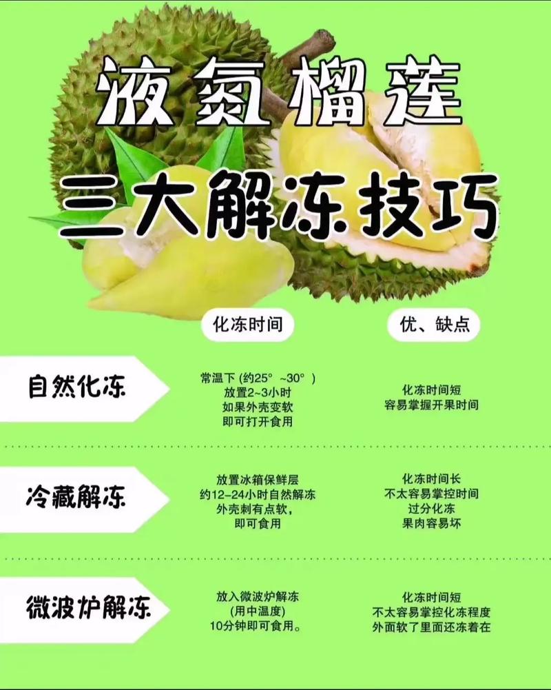 〖Five〗、正确解冻冻榴莲可以采用以下几种方法。冷藏解冻法:把冻榴莲放在冰箱冷藏室,温度一般设置在 2 - 8℃,这种方式解冻缓慢但能最大程度保留榴莲的口感和营养,大概需 8 - 12 小时。室温解冻法:将冻榴莲从冷冻室取出,放在常温环境中。此方法速度适中,但需注意周围环境的卫生。