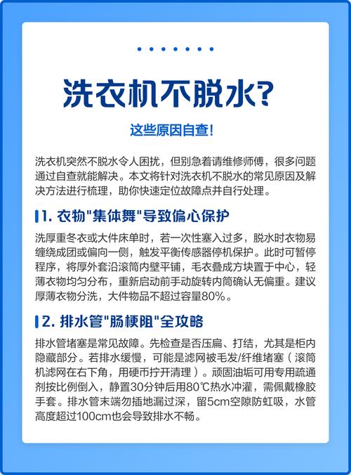 衣物偏重或洗衣机没放平如果洗衣机没放平或衣物偏重,就会导致脱水晃动大、脱水桶转不起来的问题。这时候,我们需要重新调整衣物的分布或者调整洗衣机的位置,让它放平。洗衣机盖子没关紧如果洗衣机盖子没关紧,就会启动保护机制,导致不脱水。这时候,我们需要重新关紧洗衣机盖子,确保它能够正常运转。