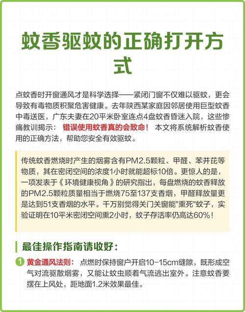 在使用蚊香时,建议先关闭门窗,这样可以更好地让蚊香的味道弥漫整个房间,达到驱蚊的效果。但在此期间,请勿停留在房间内。 大约熏蒸20至30分钟后,可以逐渐打开窗户,让室内空气流通。此时,蚊香的味道已经减弱,人们可以进入房间。 请勿同时打开所有门窗,这样做会减弱蚊香的效果。