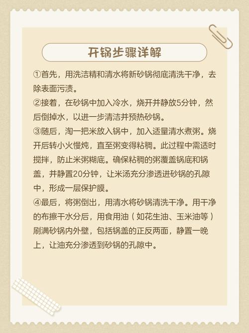 〖Three〗、新砂锅第一次使用开锅很重要,能延长其使用寿命,以下是具体开锅方法。 检查砂锅:在开锅前,仔细检查砂锅是否有裂缝、砂眼等问题。若有明显瑕疵,可能影响使用,不建议继续开锅。 浸泡清洗:将新砂锅放在清水中浸泡3 - 4小时,让砂锅充分吸收水分,使内部结构更加紧密。