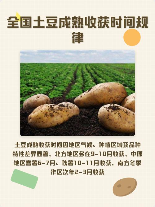 〖Four〗、土豆的成熟和收获时间根据种植季节和地区有所不同:春季种植的土豆:通常在5月左右成熟,适合挖取。在北方和西北一季作区,如东北、甘肃、青海等地,春季种植,秋季收获。夏季种植的土豆:一般在7月左右成熟,同样适宜收获。在中原及中南二季作区,如山东、河北、河南等地,春薯于23月播种,67月收获。