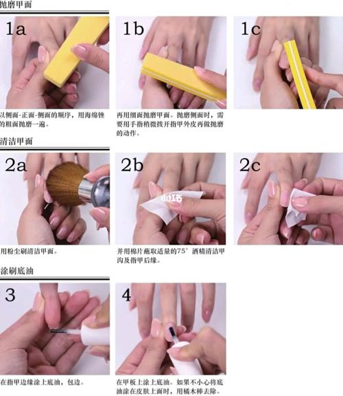 底油的作用是保护真指甲,首先涂抹一层底油。这样可以延长颜色指甲油的持久性,并防止颜色渗透到真指甲上。下面,涂抹指甲油。选取你喜欢的颜色,并确保每层均匀涂抹,让颜色鲜艳丰富。最后,涂抹亮油。亮油的作用是保持指甲油的颜色鲜亮,并增加光泽度。它能让你的指甲看起来更加迷人。