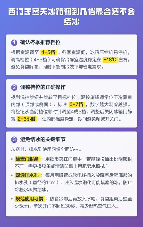 冬天冰箱一般调到1『3』档可减少结冰,具体需结合环境温度和冰箱类型调整。档位设置的核心逻辑 制冷强度与档位关系:冰箱档位数字越大,制冷强度越强。当环境温度较低时,需要降低制冷强度,以避免蒸发器过度结霜。