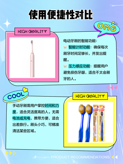 选取建议:对于年龄较小或刷牙能力较弱的儿童,建议先使用手动牙刷,由家长辅助指导,逐步培养正确的刷牙习惯。随着儿童年龄增长和动手能力提升,可尝试引入电动牙刷,但需选取适合儿童口腔结构的型号,并监督使用过程,避免过度用力。