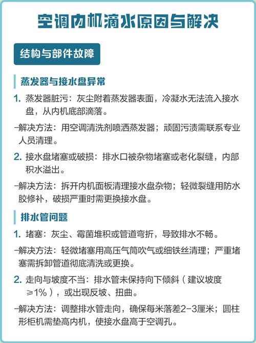 〖One〗、空调内机滴水主要是冷凝水排放异常、安装问题、部件故障以及使用维护不当这几方面原因造成的。冷凝水排放系统故障1)要是排水管里有灰尘、蚊虫尸体或者杂物,排水就会不畅,冷凝水没法及时排出就会从内机滴下来。2)排水管老化破损、接口松动或者安装位置变了,冷凝水会从破损处或者管道缝隙渗出来滴到室内。