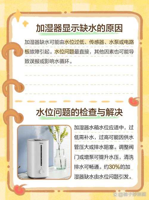 水箱缺水:当加湿器中的水箱没有足够的水时,加湿器会显示缺水。这通常是因为用户忘记加水,或者水箱中的水已经用完。解决方法是及时为加湿器补充水量,确保水箱中有足够的水量。 水位感应装置故障:加湿器内部的水位感应装置用于检测水箱中的水位。如果这个装置出现故障,它可能会错误地发送缺水信号,即使水箱中有水。