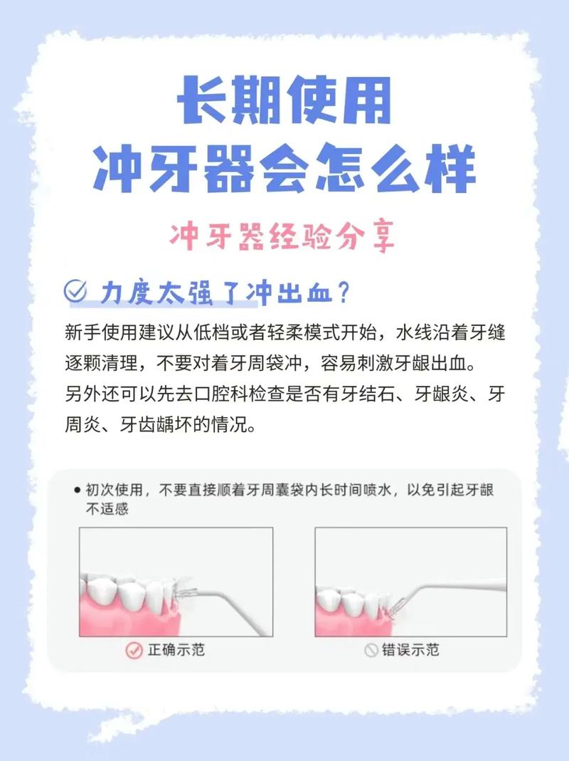 正确使用冲牙器通常不会对牙齿造成损伤,但不当使用可能引发牙龈出血等短期现象,而“牙缝变大”等担忧属于误解。 以下从常见疑问角度展开分析: 牙龈出血:短期现象,与炎症相关,非冲牙器本身导致部分用户初次使用冲牙器时可能出现牙龈出血,这并非冲牙器损伤牙齿或牙龈,而是牙龈存在炎症的信号。