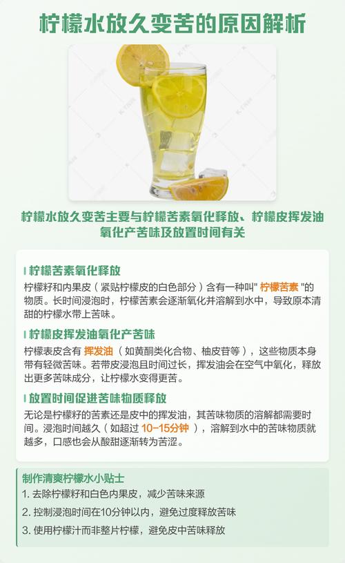 〖One〗、柠檬水放久了会发苦,主要原因有以下几点:柠檬中含有柠檬苦素:柠檬苦素是柠檬中的一种天然成分,尤其在柠檬籽中含量较高。当柠檬水放置过久,柠檬苦素会逐渐溶解在水中,导致柠檬水发苦。热水加速苦味物质溶解:如果用热水泡柠檬,柠檬中的苦味物质的溶解速度会加快,从而使柠檬水更容易发苦。