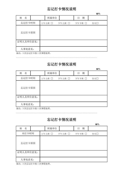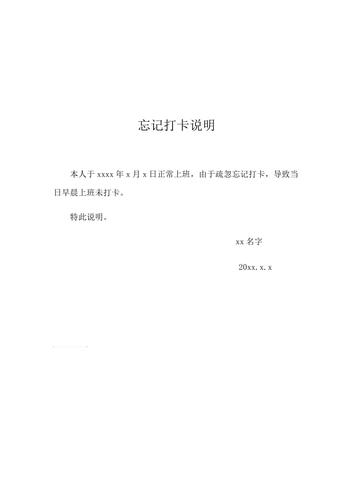 〖Four〗、上班忘记打卡自责说明 篇一:本人于X月X日疏忽忘记打卡。对此 oversight,我深感自责。确保今后将加强时间管理,避免类似情况发生。篇二:特此证明,我,部员工,工号,于20xx年x月x日未能按时打卡。我承认这一失误,并将采取措施确保今后准时上下班打卡。