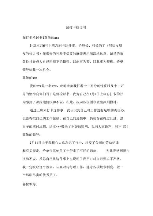 〖One〗、我因个人疏忽未能在规定的工作时间进行打卡,这显然违反了公司的考勤制度。我深感歉意,并认识到了自己的错误。 我已经深刻反思,意识到制度的严肃性和对公司运营秩序的重要性。我承认这次的漏打卡是我的过失,我愿意为此承担责任。