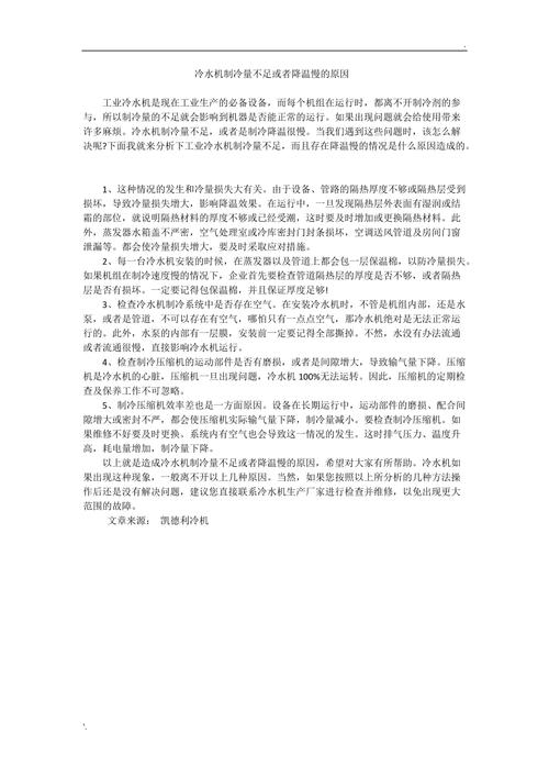 〖Four〗、补充冷媒:及时补充冷媒是保证冷水机制冷效果不降的有效措施之一。但需要注意,冷媒的补充需要在专业技术人员的指导下进行。结论 冷水机制冷慢的问题不仅会影响工作效率,也会增加设备的维修费用。