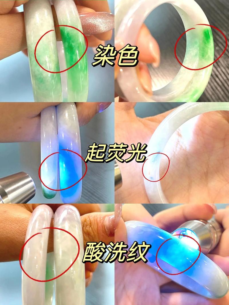 〖Two〗、鉴别注胶翡翠手镯的方法包括水煮、使用验钞灯照射和刻划测试。将手镯放入热水中煮沸,天然翡翠即使经过水煮也不会有明显变化。相反,注胶翡翠在加热后可能会出现质地变浑浊甚至掉色的情况。 检查手镯的颜色分布。注胶过程会破坏翡翠的内部结构,并改变其光学特性。
