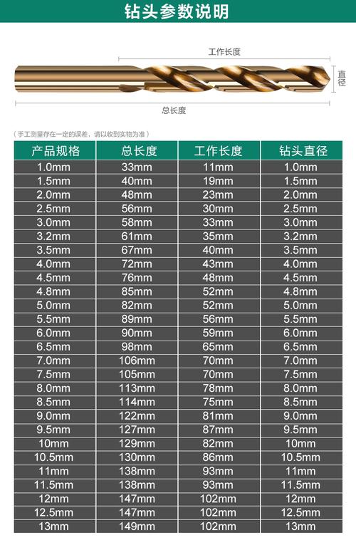 M3钻头:全长65mm、柄径5mm、刃长13mm、小径4mm、大径5mm。M4钻头:全长75mm、柄径0mm、刃长18mm、小径5mm、大径0mm。M5钻头:全长85mm、柄径5mm、刃长22mm、小径5mm、大径5mm。M6钻头:全长90mm、柄径10mm、刃长25mm、小径6mm、大径10mm。