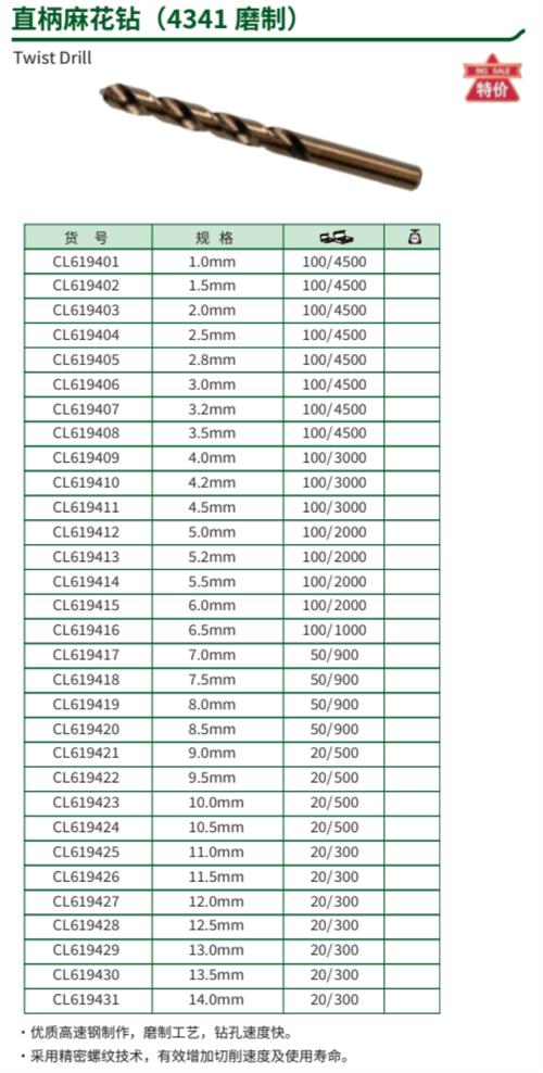 问题一:麻花钻头有哪些规格?麻花钻头通常有8mm、10mm、12mm、14mm、16mm等不同的规格。不同规格的麻花钻头适用于不同的使用场景,如建筑中用于开孔,家具中用于安装螺丝等。问题二:麻花钻头的磨法有哪些?麻花钻头的磨法包括锥形磨法和圆形磨法。