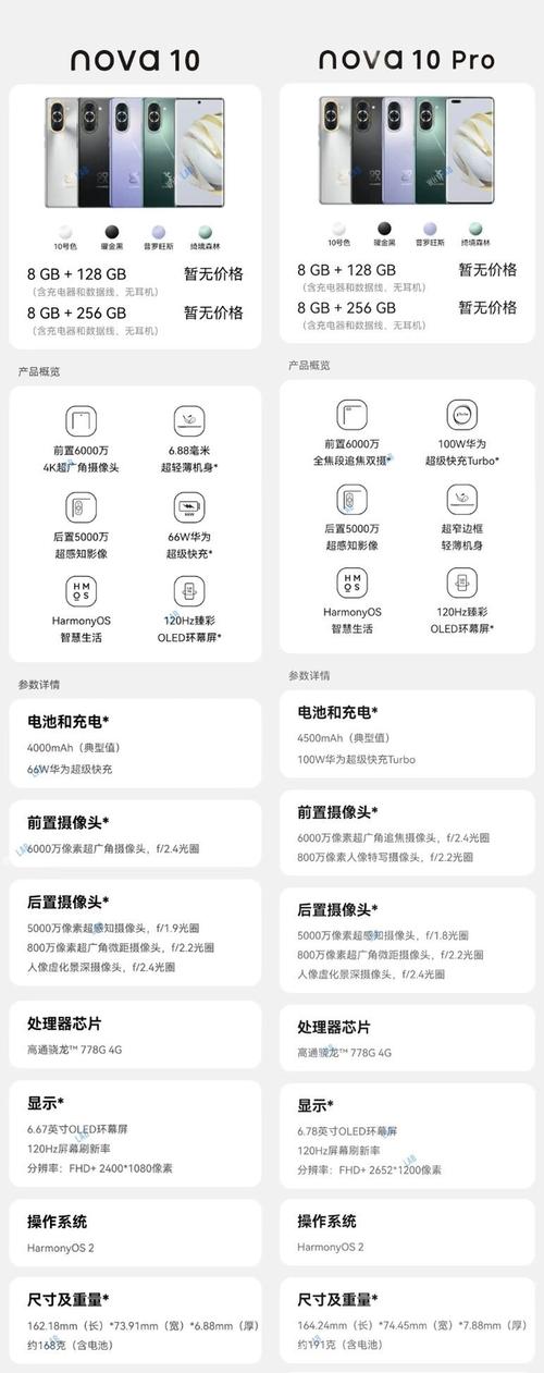 〖Three〗、从上表就能看出,它们主要是屏幕、摄像头和续航的区别。nova10pro的屏幕更大,分辨率也更高。后置相机方面主要是nova10pro的主摄光圈更大。同时,nova10pro的前摄还比普通版多了一个800万像素的人像特写镜头。续航能力也是pro版更强,电池多了500mAh,并增加了34w的快充。