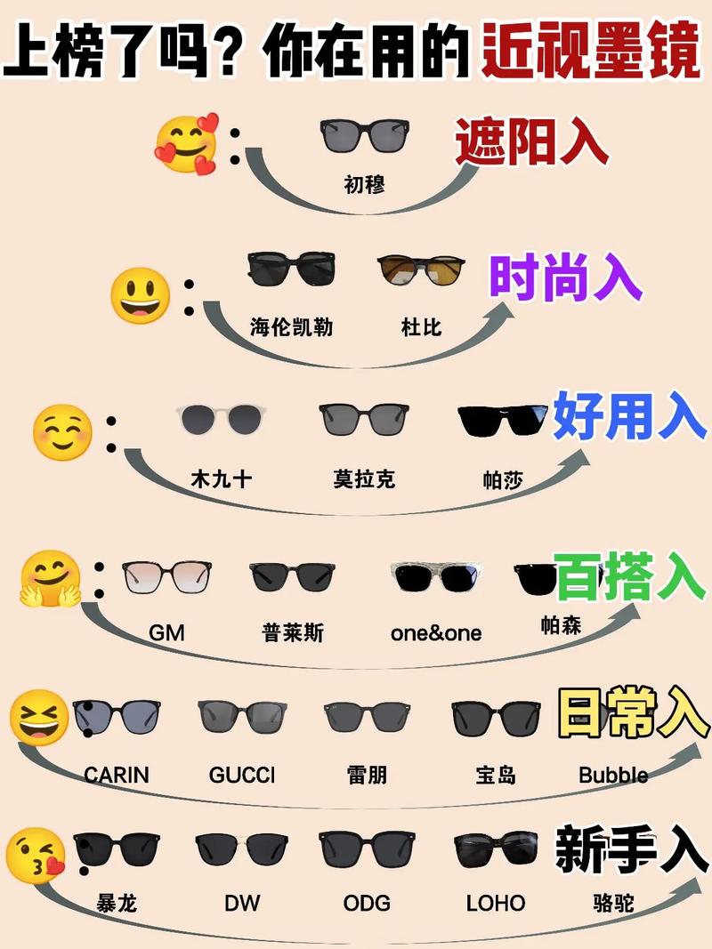 〖One〗、选取合适的色彩:近视眼选取墨镜时,一般建议选取深灰色、绿色或棕色的墨镜。这是因为这三种颜色的墨镜可以过滤掉大部分的有害光线,如紫外线、蓝光等,同时对色彩的影响也较小,不会影响准确地识别颜色。 选取合适的材质:墨镜的材质也是非常重要的选取因素。