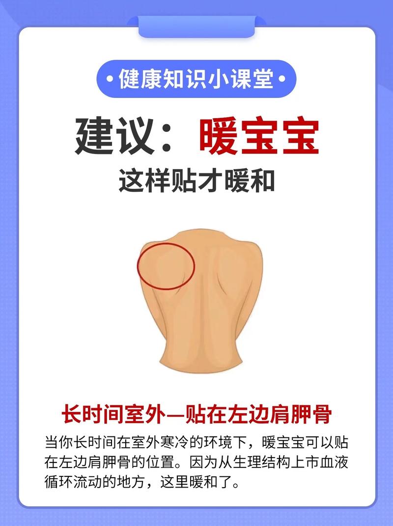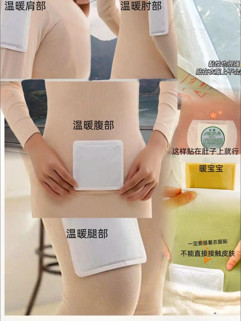 暖宝宝可以贴在多个部位进行保暖,如背部、腹部和颈部。 感冒时,可以将暖宝宝贴在脚底以促进体温。 女性痛经时,暖宝宝贴在腹部有助于血液循环和缓解不适。 腰腿不适时,暖宝宝可以贴在这些部位进行缓解调理。 使用暖宝宝时,应隔一层衣服以保证使用效果和安全。