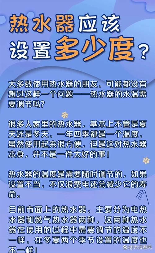 热水器冬季不关,温度设定为适宜的温度范围可省电。热水器在冬季长时间开启是常态,为了节约能源,合理的温度设定至关重要。以下是关于热水器在冬季如何设定温度以节省电能的 适宜的温度设定 在冬季,热水器温度不必过高,设置在40『5』0摄氏度之间为宜。