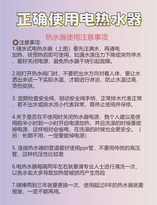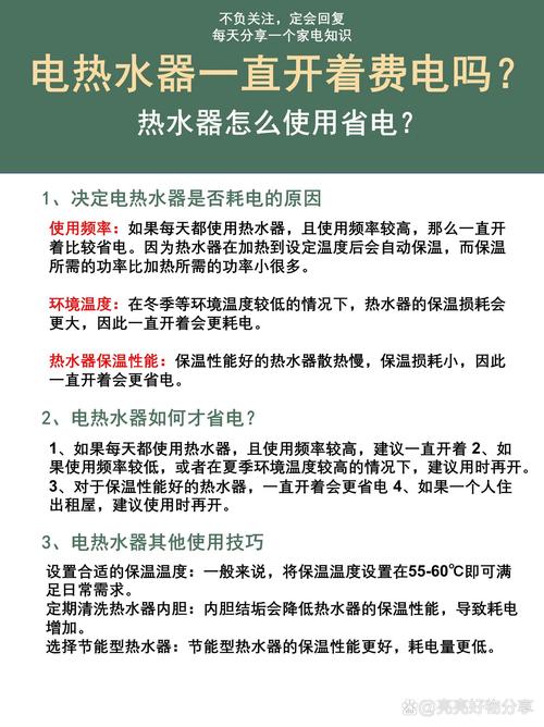 〖Four〗、避开高峰时段使用电热水器:在用电高峰期,电热水器的使用会导致电网压力增大,耗电量增加。因此,尽量在用电高峰时段之外使用电热水器,以节省电能。合理设定热水器温度:根据个人喜好和季节调整热水器温度。夏季可将温度设定在42摄氏度左右,冬季则可设定在46摄氏度左右。