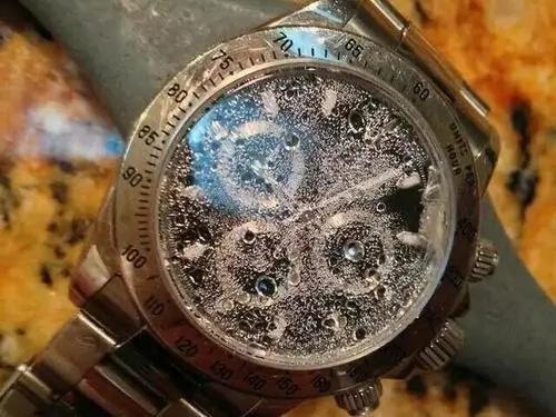 由于手表的密封圈老化,导致进水,从而产生水雾。密封圈防水性能暂时失效,比如佩戴手表去蒸桑拿,淋热水浴等,由于密封圈是橡胶材质,这时由于热胀冷缩而导致进水,之后手表又恢复防水性能。将表面朝内,底壳朝外,反戴在手腕上,利用人的体温来去除水雾,这样数小时后表里的雾气也可消除。